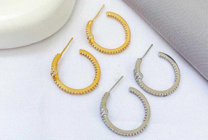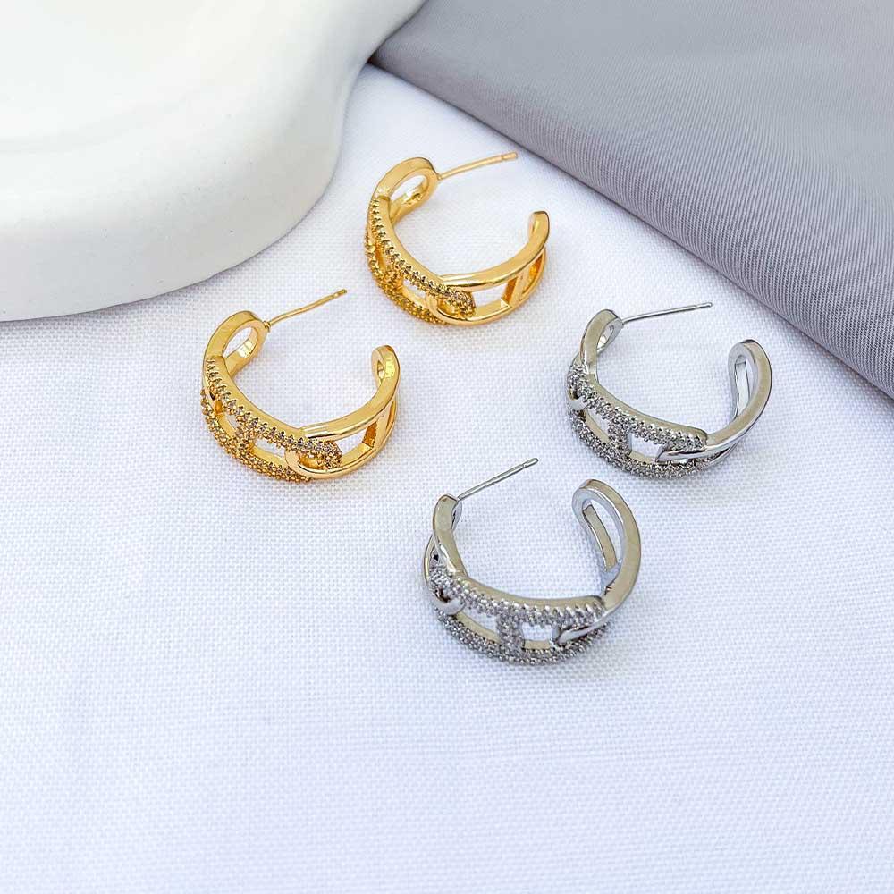 Brinco Argola M de pino elos Lisos e Cravejados com micro zircônias banho Ouro